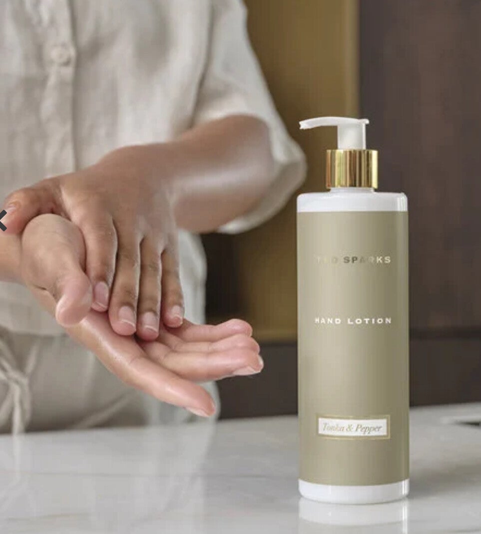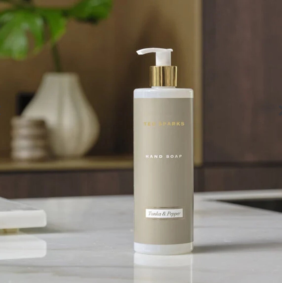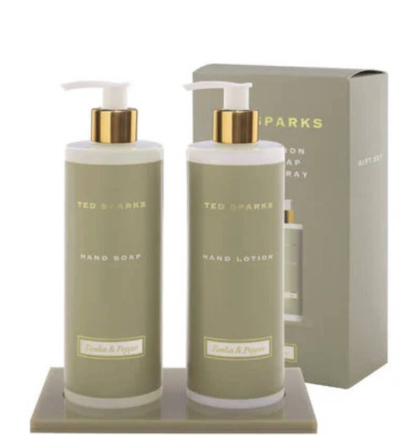 Een stijlvol duo en een prachtig cadeau: de Ted Sparks Hand Gift Set Tonka & Pepper. De Hand Soap & Hand Lotion geven je handen wat ze nodig hebben: luxueuze verzorging en voeding met de geur van Tonka & Pepper.